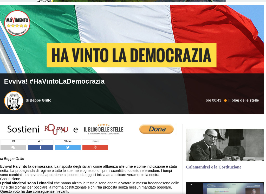 Λίγα λεπτά αφότου ο Ιταλός πρωθυπουργός Ματέο Ρέντσι παραδέχθηκε την ήττα και του δήλωσε ότι παραιτείται από την πρωθυπουργία της Ιταλία, ο Μπέπε Γκρίλο τούιταρε τη λέξη «Εβίβα», παραπέμποντας στο μήνυμα που έχει αναρτήσει στην ηλεκτρονική ιστοσελίδα του.